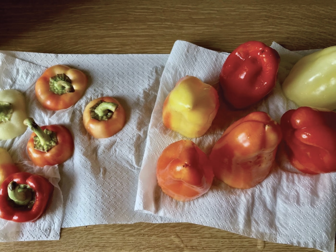 Umyj papryki pod bieżącą wodą i dokładnie osusz ręcznikami papierowymi.
