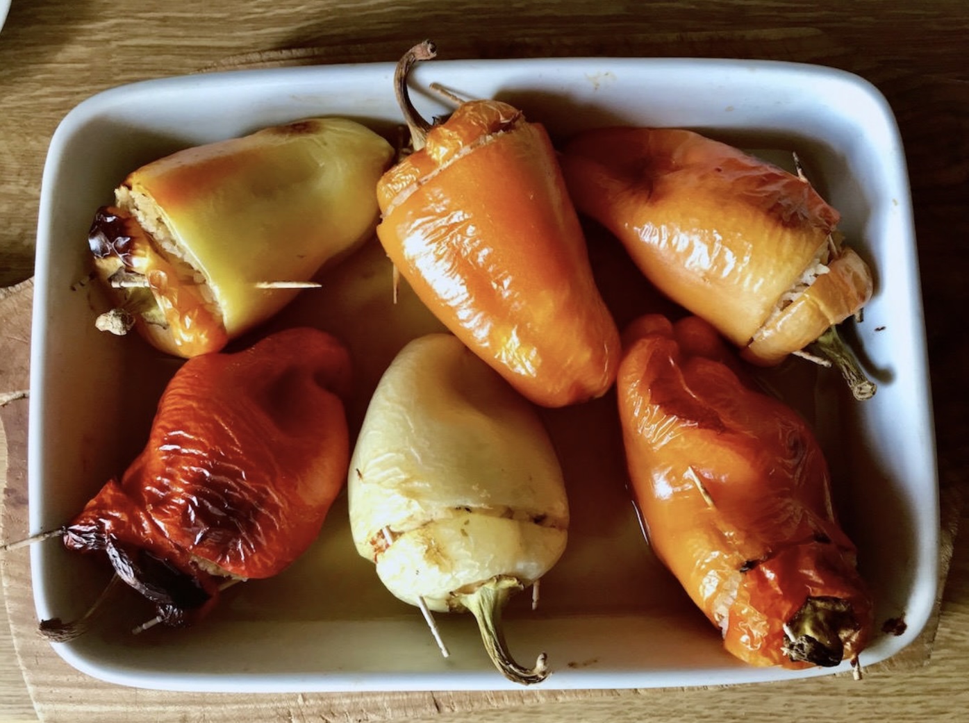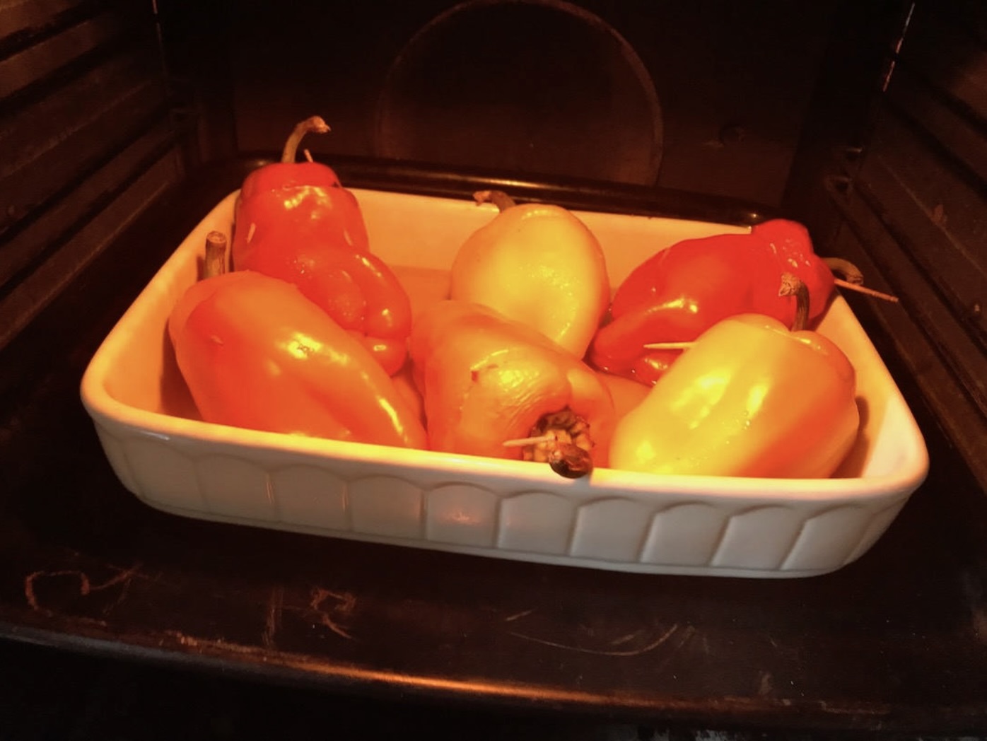 Wyjmij upieczoną paprykę z piekarnika i usuń wykałaczki.