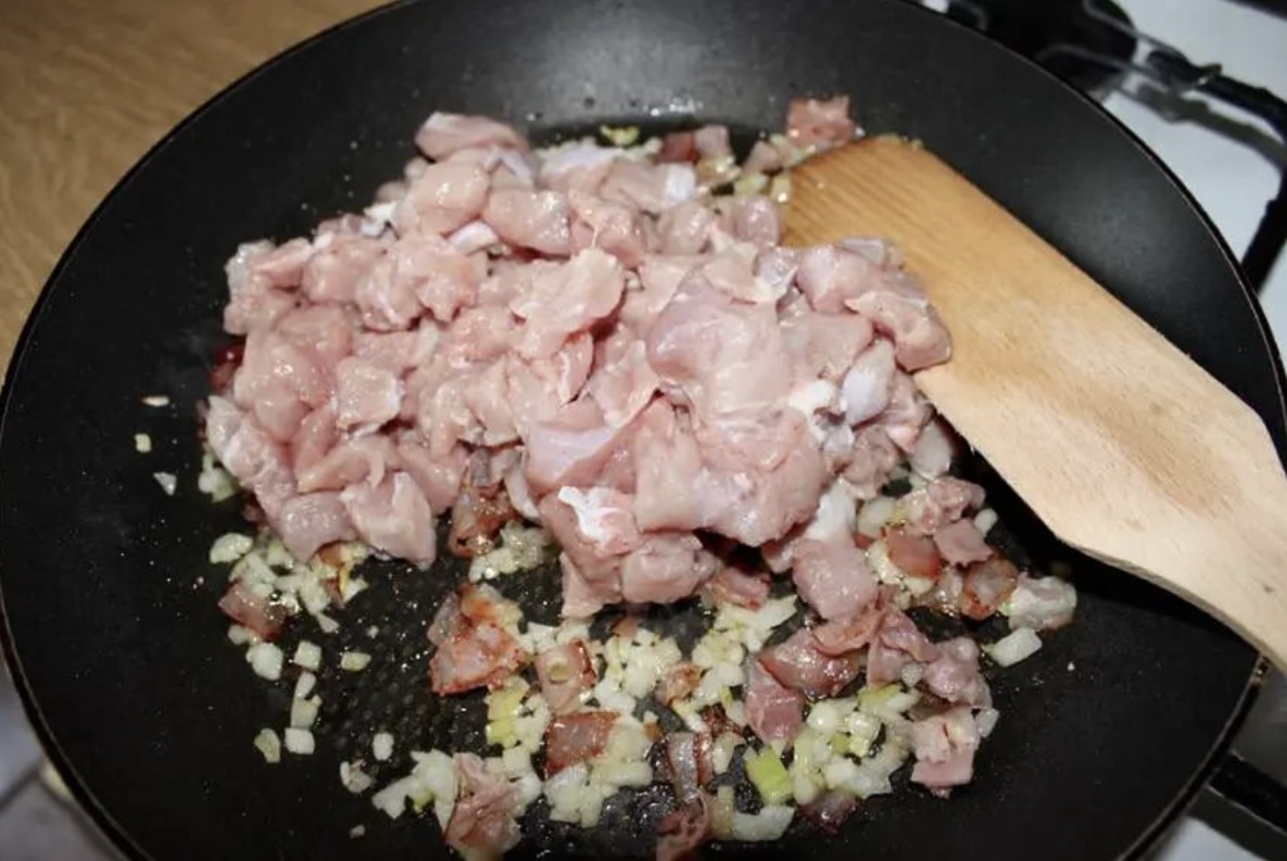Mięso dokładnie umyj pod bieżącą wodą, osusz ręcznikami papierowymi, a następnie odkrój nadmiar tłuszczu. Pokrój je w kostkę.