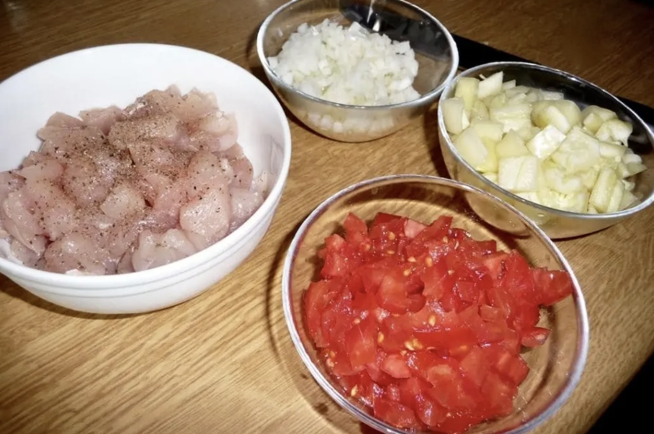 Pierś z kurczaka, cebulę oraz paprykę pokrój w niedużą kostkę. Pomidory obierz ze skóry i pokrój w kosteczkę.