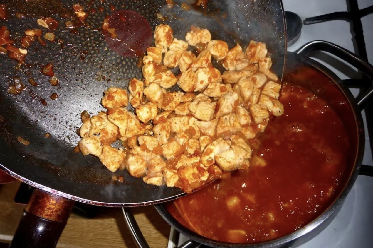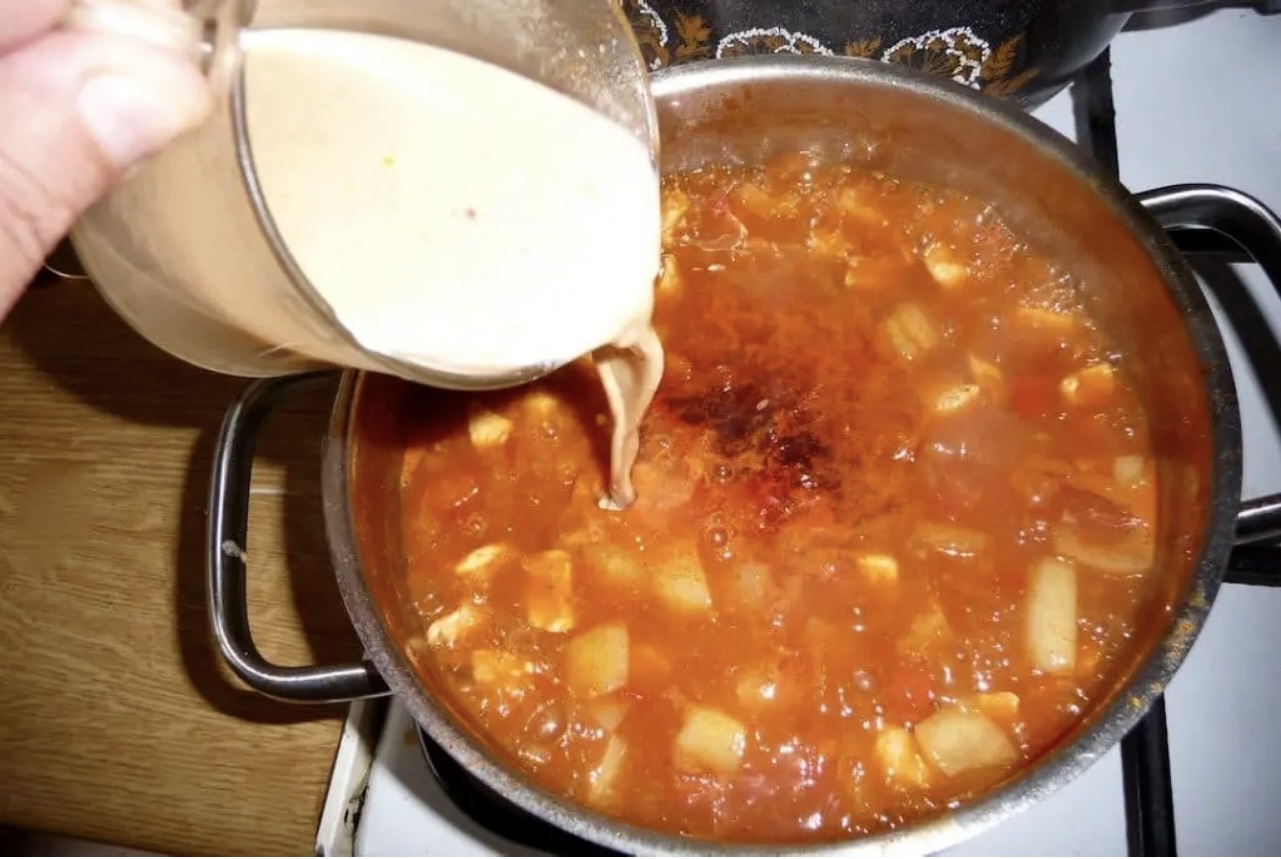 Natychmiast wlej 1–2 chochle gorącej wody i wymieszaj, aby uzyskać gładki sos paprykowy.