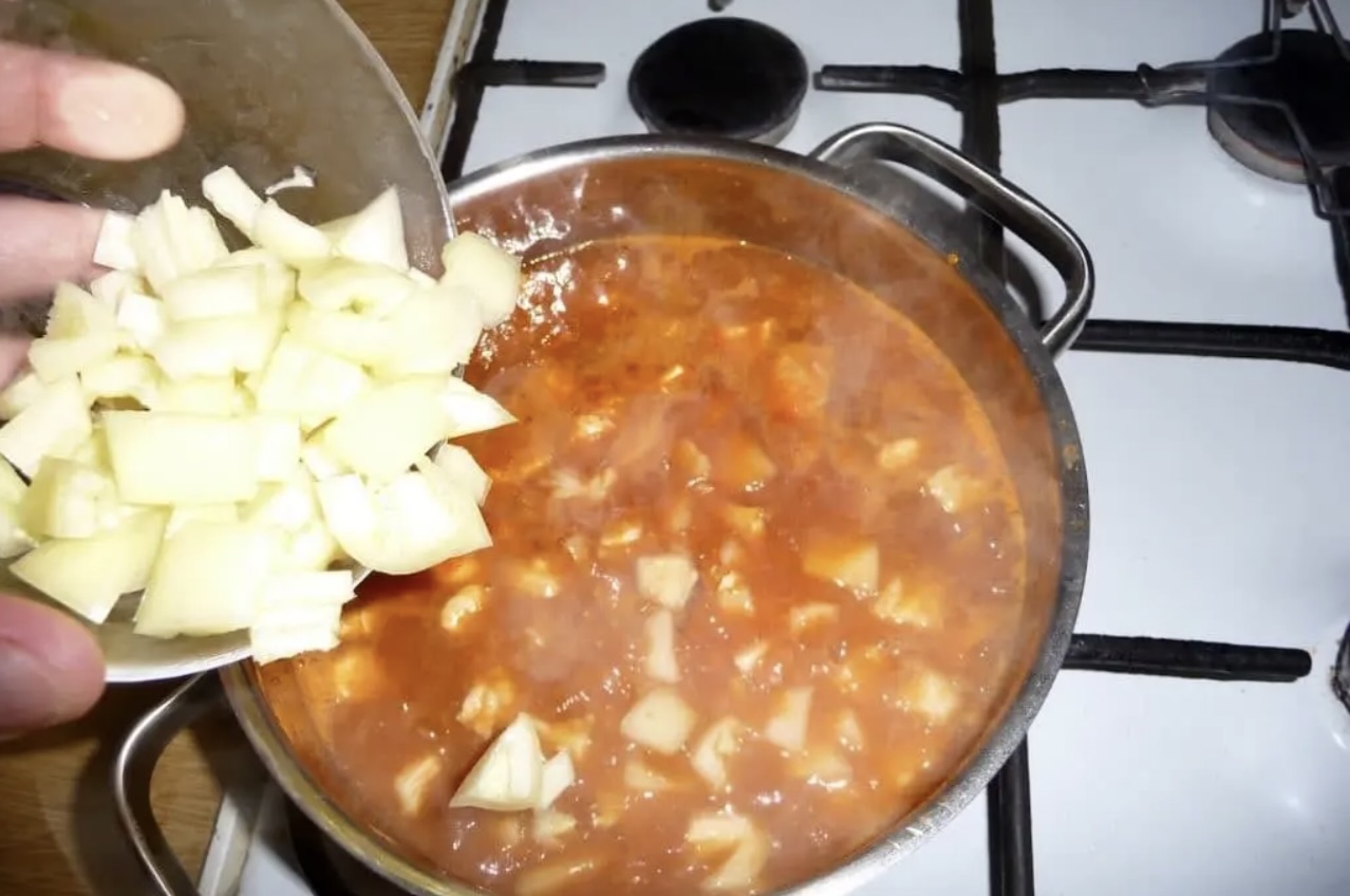 Wlej całość do garnka. Doprowadź paprykarz do wrzenia i duś na wolnym ogniu jeszcze 2 minuty, aż sos nieco zgęstnieje.