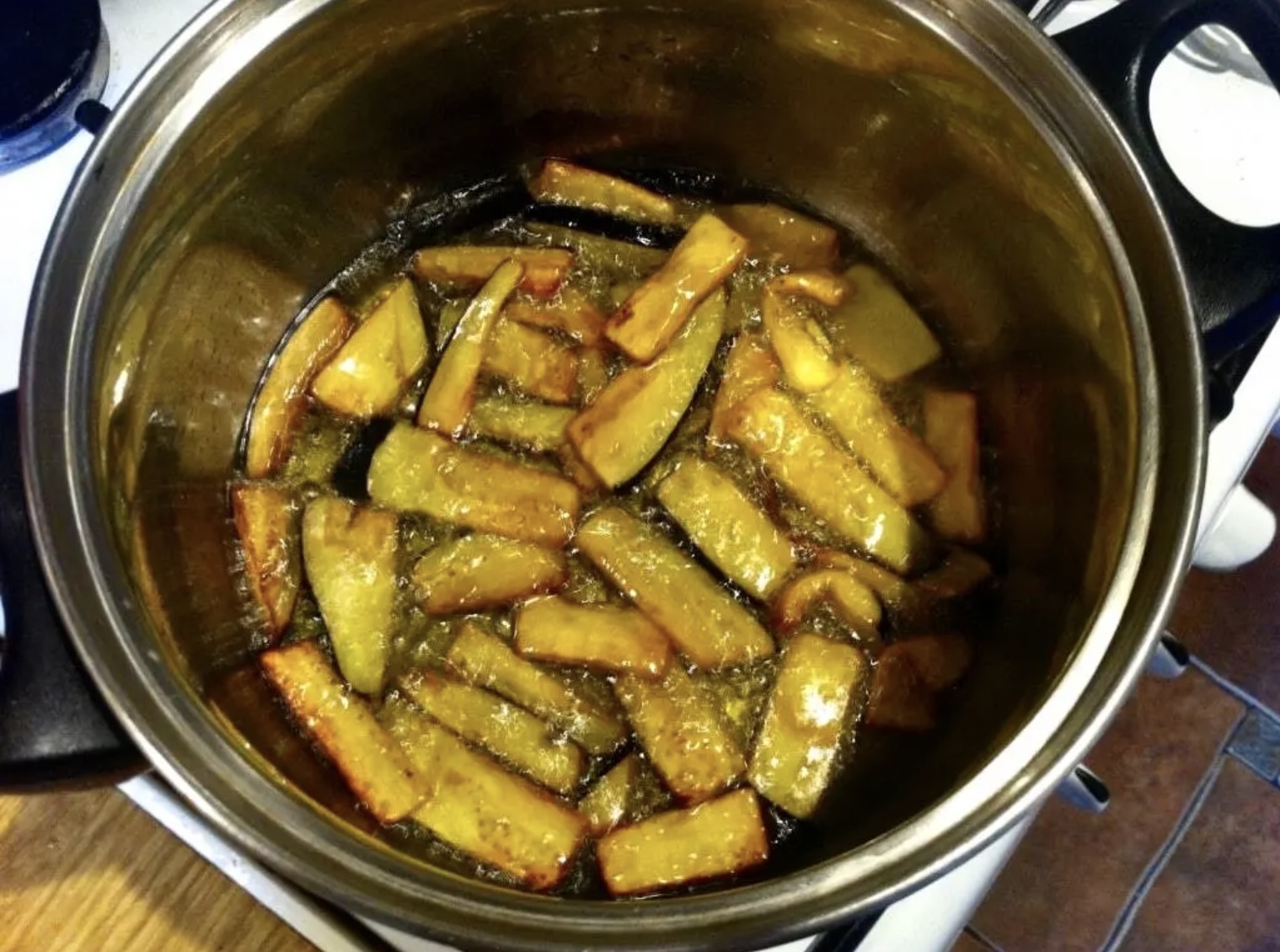 W garnku rozgrzej oliwę, a następnie usmaż na złoto słupki oraz 3 odłożone plastry.