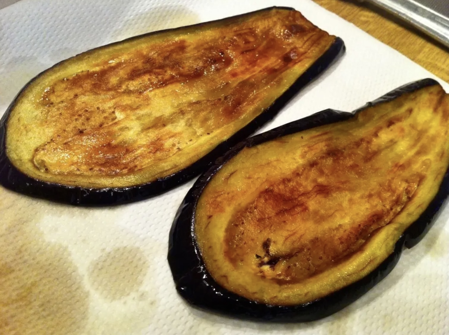 Wszystkie usmażone kawałki bakłażana osusz z nadmiaru tłuszczu na ręczniku papierowym.