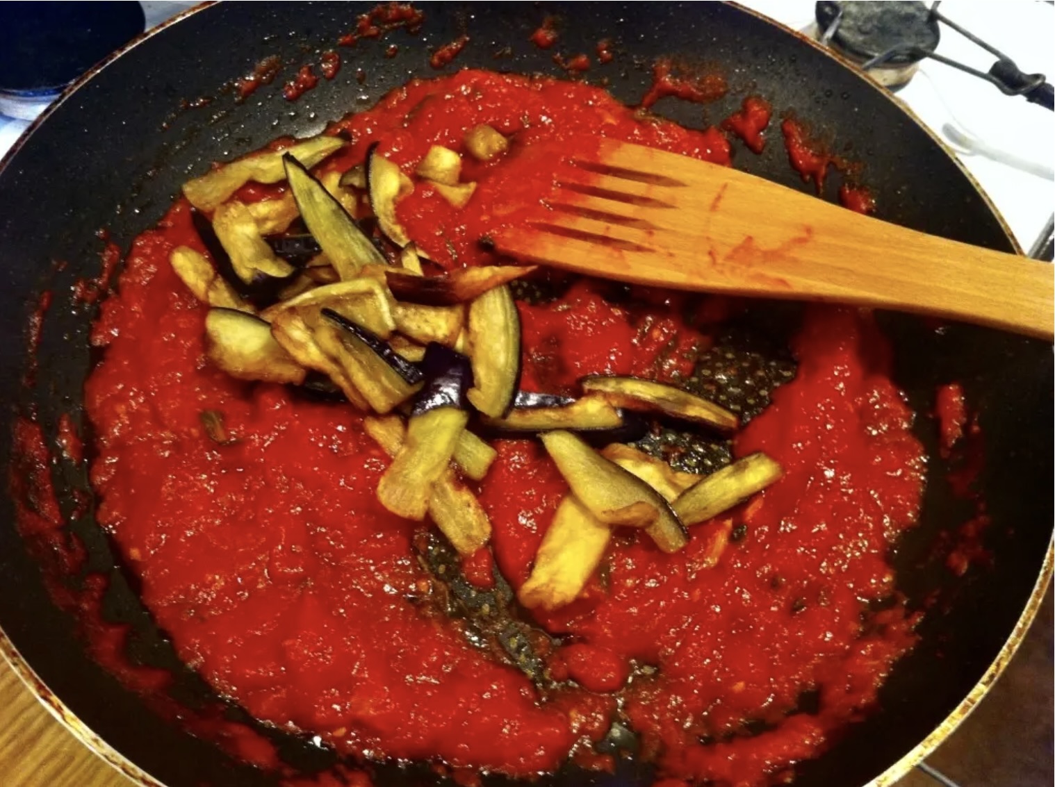 Do zredukowanego sosu pomidorowego wrzuć 3/4 usmażonych „chipsów” bakłażanowych i zamieszaj. Pozostałe 1/4 przyda się do dekoracji.