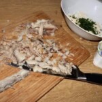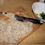 Siekanie ryby: Mięso belony pozbawione ości posiekaj bardzo drobno. Jeśli chcesz uzyskać bardzo gładką pastę, możesz dodatkowo ugnieść posiekane mięso szerokim nożem. Odłóż na bok.