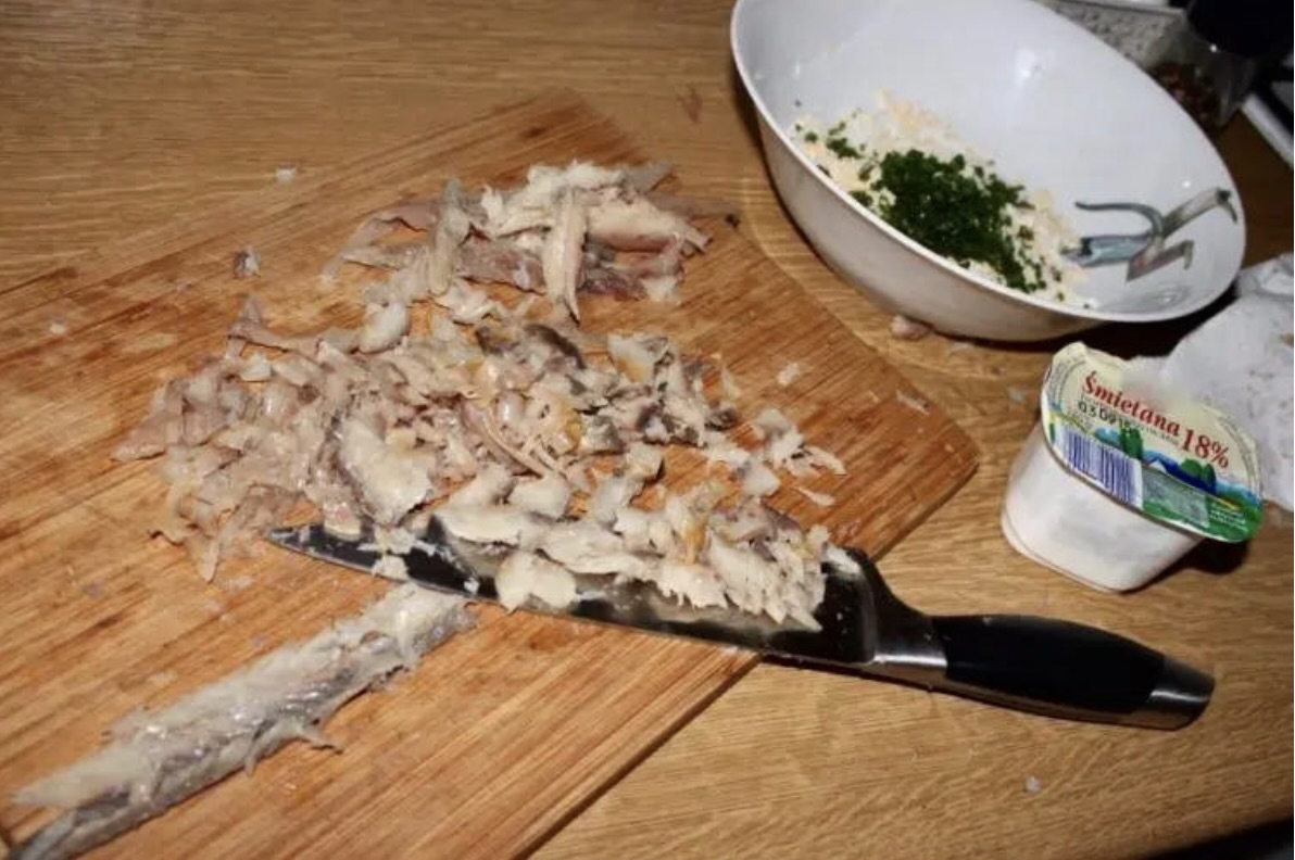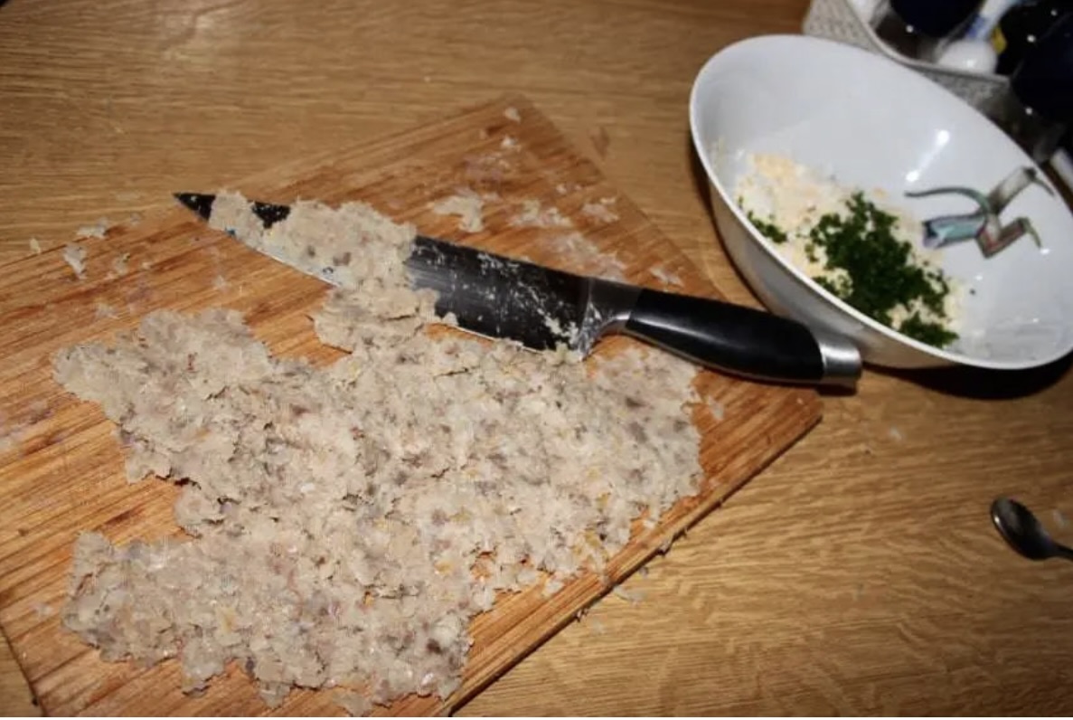 Siekanie ryby: Mięso belony pozbawione ości posiekaj bardzo drobno. Jeśli chcesz uzyskać bardzo gładką pastę, możesz dodatkowo ugnieść posiekane mięso szerokim nożem. Odłóż na bok.