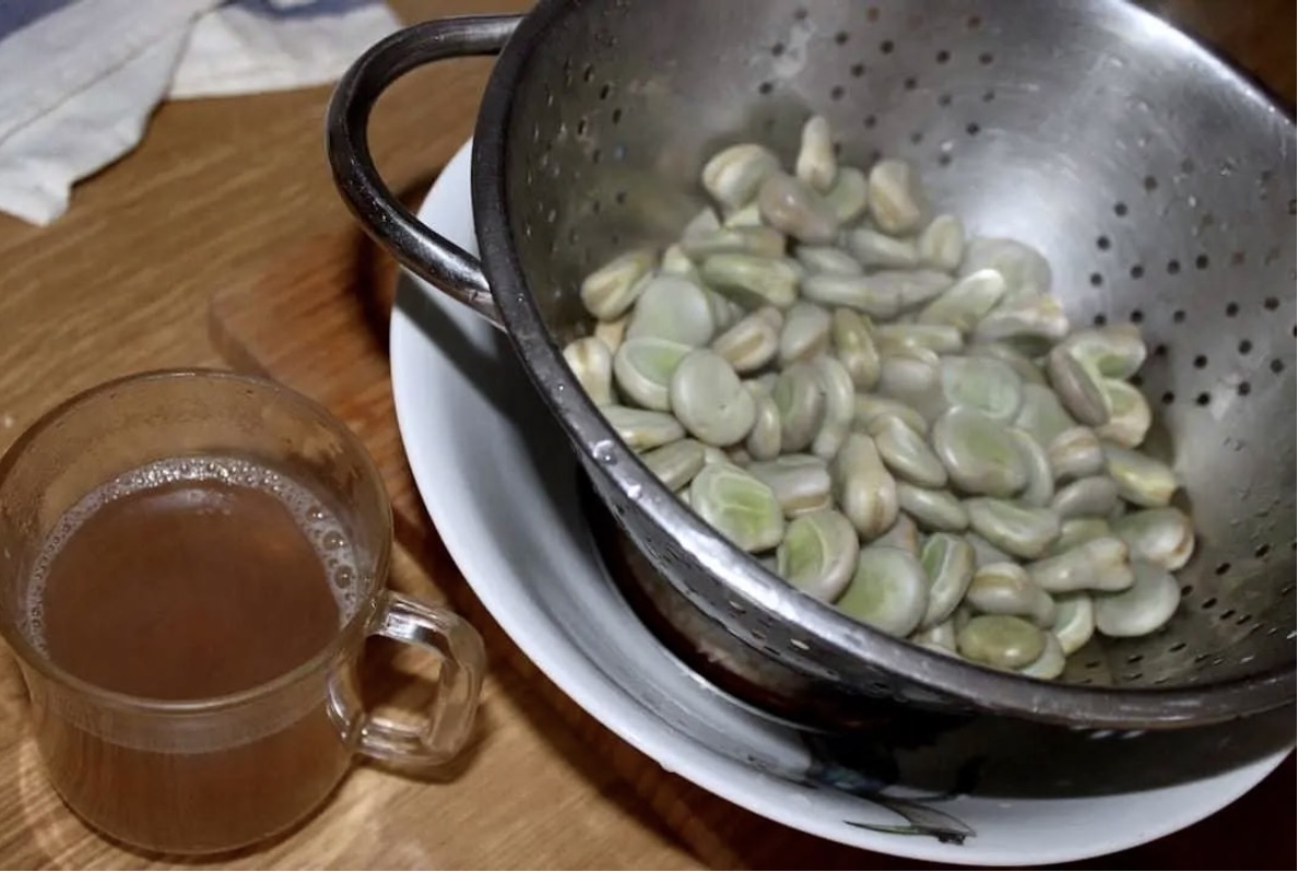 Przygotowanie bobu: Odcedź bób, pozostawiając pół szklanki wody z gotowania. Obierz bób z łupinek.