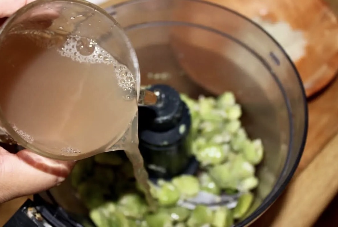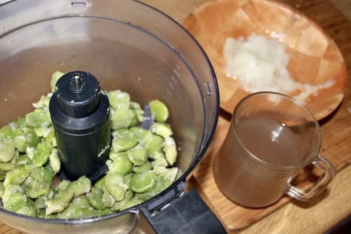 Miksowanie: Obrany bób przełóż do miski malaksera. Miksuj, dolewając stopniowo wodę z gotowania, aż uzyskasz gęstą, gładką masę.