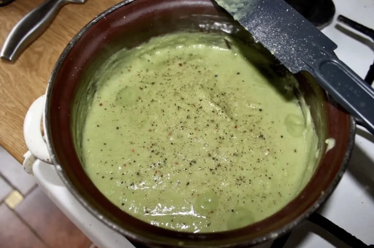 Gotowanie pasty: Uzyskaną masę przelej do garnka i dodaj startą cebulę (uważać, by nie przesadzić z ilością). Całość posól i popieprz (dość sporo) i gotuj na wolnym ogniu przez kilka minut, aż masa zgęstnieje, a nadmiar wody odparuje.