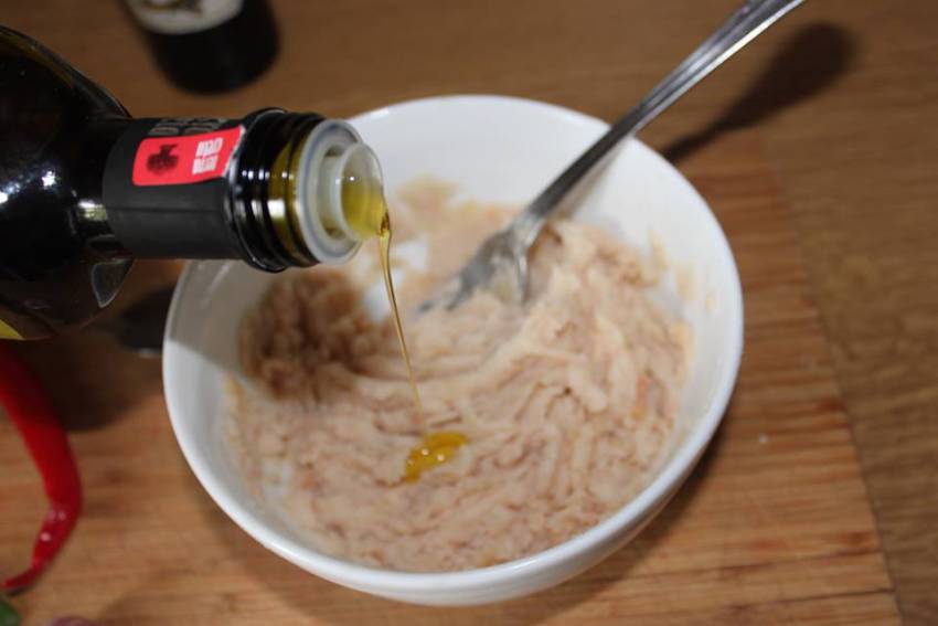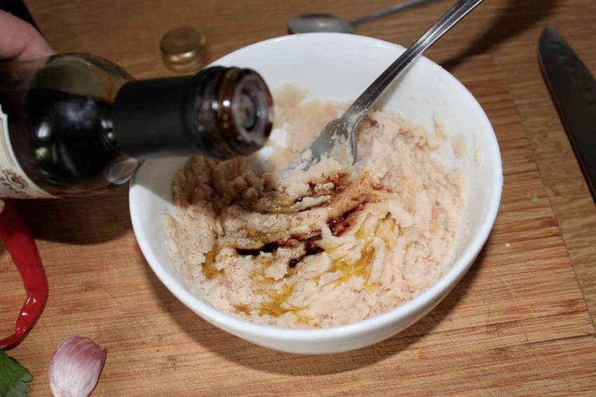 Miksowanie: Przełóż fasolkę do miski i rozgnieć ją widelcem na gładką pastę. Aby ułatwić zgniatanie i uzyskać lepszą konsystencję, wlej 1-2 łyżeczki oliwy i 1-2 łyżeczki octu balsamicznego (dodawaj te płyny stopniowo).
