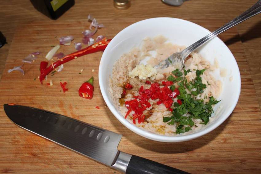 Dodawanie dodatków: Do fasoli dodaj drobno posiekaną papryczkę chili, posiekaną natkę pietruszki oraz obrany i zmiażdżony ząbek czosnku.