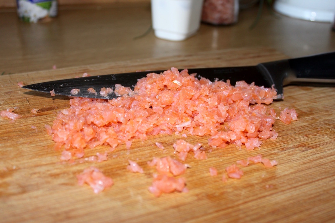 Przygotowanie łososia: Łososia dokładnie przesiekaj ostrym nożem i przełóż do dużej miski.