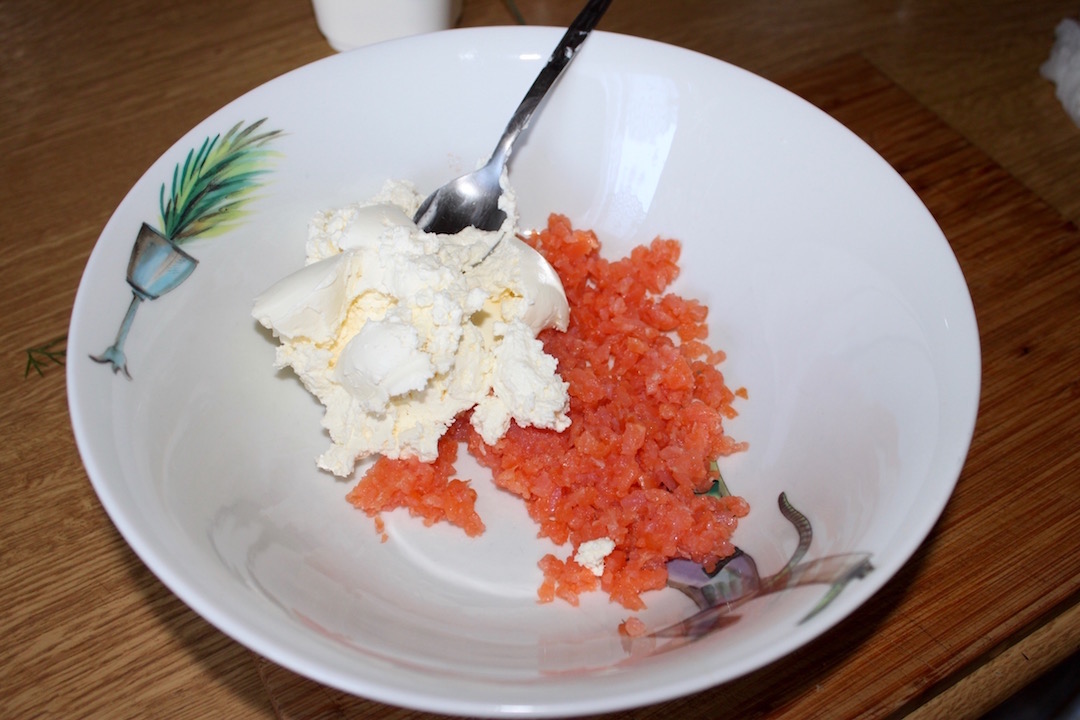 Mieszanie składników: Do miski z łososiem dodaj puszysty serek naturalny (ważne, aby był naturalny lub śmietankowy, bez dodatków smakowych).