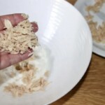 Mieszanie składników: Przełóż cały serek kozi do miski. Tuńczyka podziel na małe kawałki i dodaj do sera.