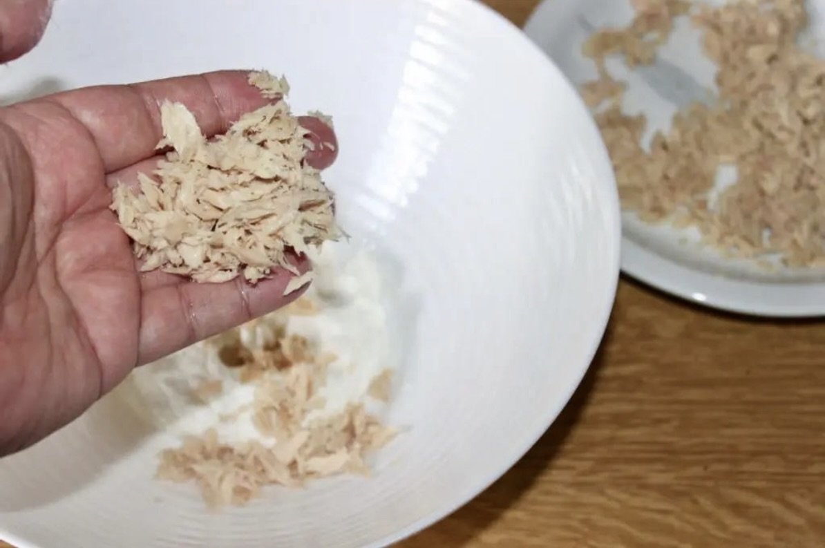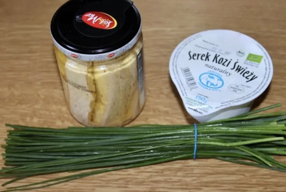 Mieszanie składników: Przełóż cały serek kozi do miski. Tuńczyka podziel na małe kawałki i dodaj do sera.