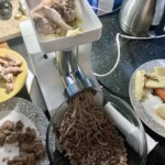 Zmiel ugotowane mięso, warzywa z rosołu oraz przesmażoną cebulę w maszynce do mięsa. Dodatek warzyw pomoże farszowi pozostać soczystym.
