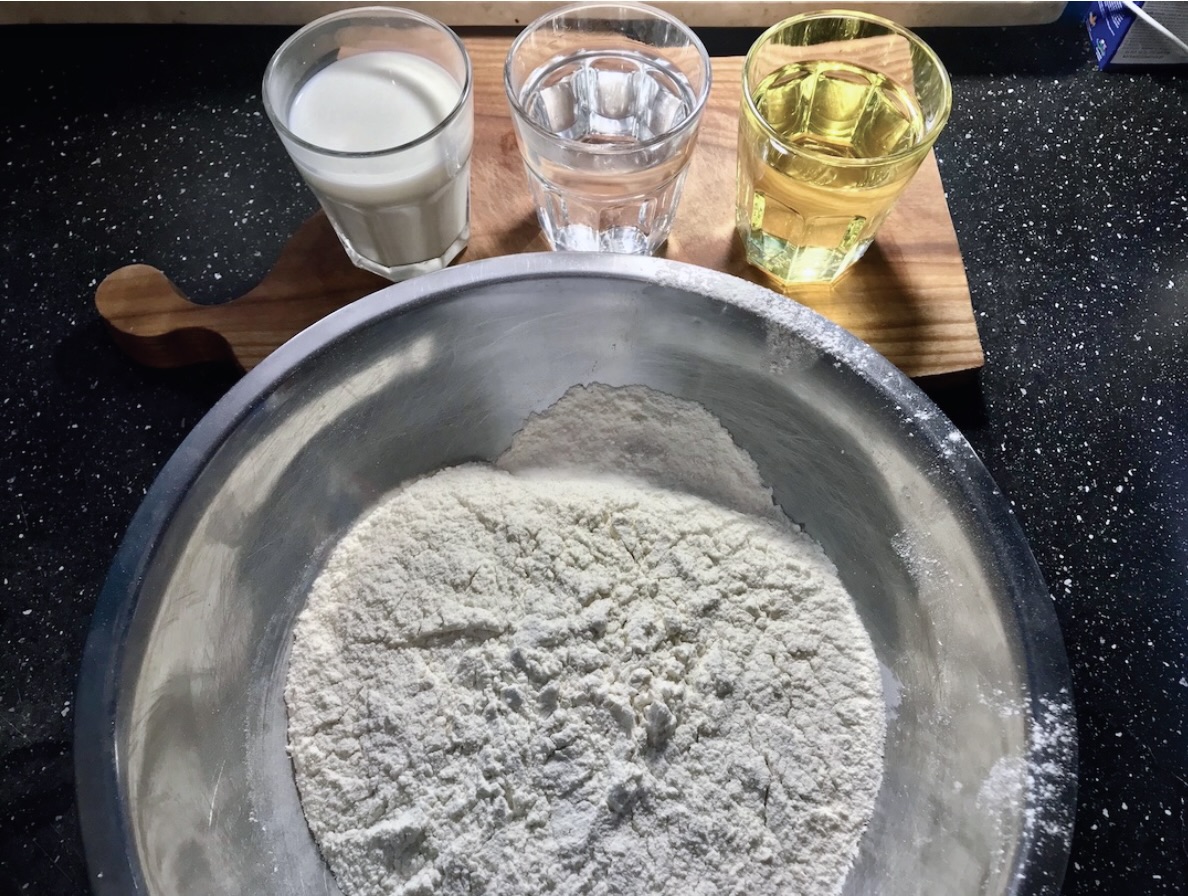 Wsyp mąkę do miski. Wlej letnie mleko i wodę.