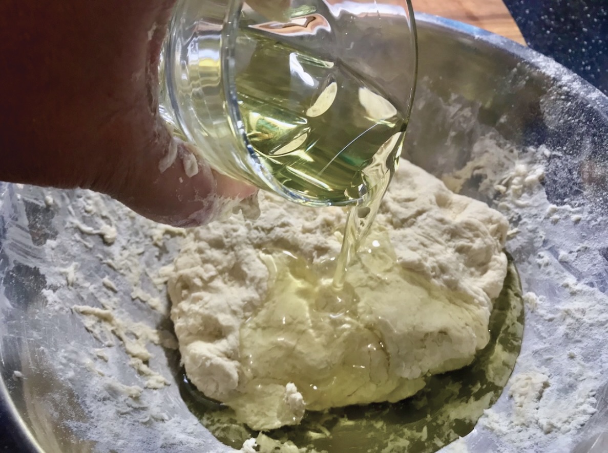 Następnie wlej olej i zagniataj ciasto przez 10 minut. Mimo że na początku może wydawać się zwarzone, kontynuuj zagniatanie. Ostatecznie uzyskasz piękne, jednolite i bardzo elastyczne ciasto.