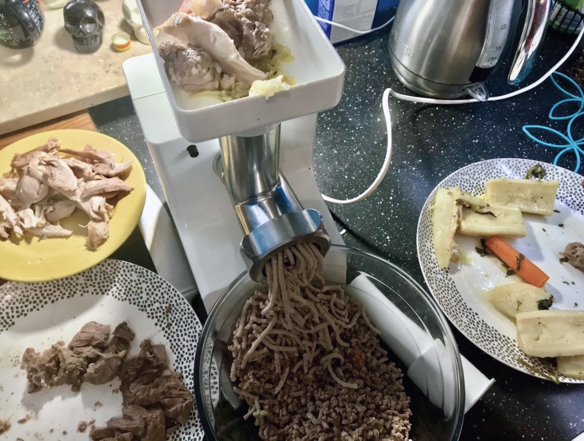 Zmiel ugotowane mięso, warzywa z rosołu oraz przesmażoną cebulę w maszynce do mięsa. Dodatek warzyw pomoże farszowi pozostać soczystym.