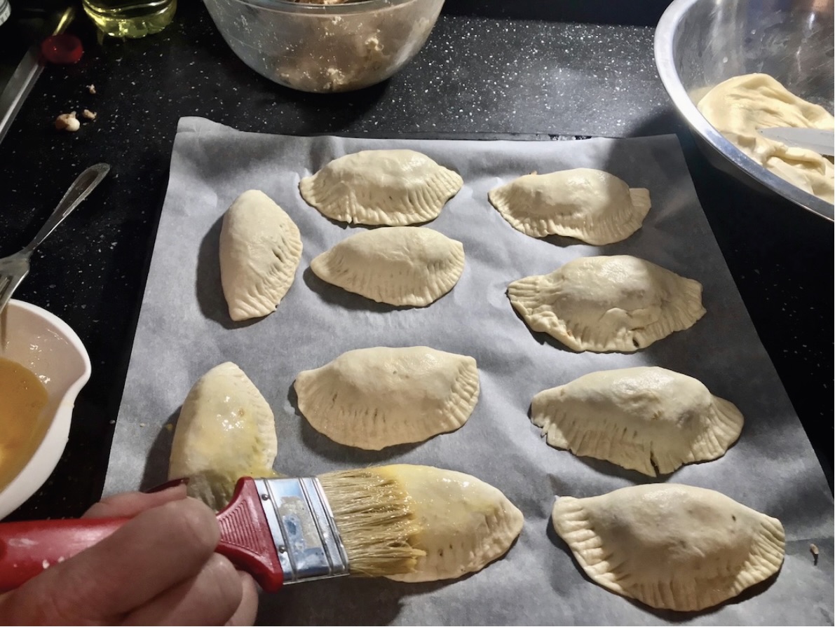 Paszteciki układaj na blasze wyłożonej papierem do pieczenia i posmaruj dobrze rozklóconym jajkiem.