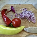 Przygotowanie farszu: Drobno posiekaj cebulę i pokrój paprykę. Na patelni rozgrzej oliwę i zeszklij cebulę. Następnie dodaj mięso i smaż, aż zbrązowieje. Dodaj sól i paprykę. Dodaj starty pomidor oraz ostrą pastę paprykową, a następnie smaż farsz kilka minut i dopraw do smaku.