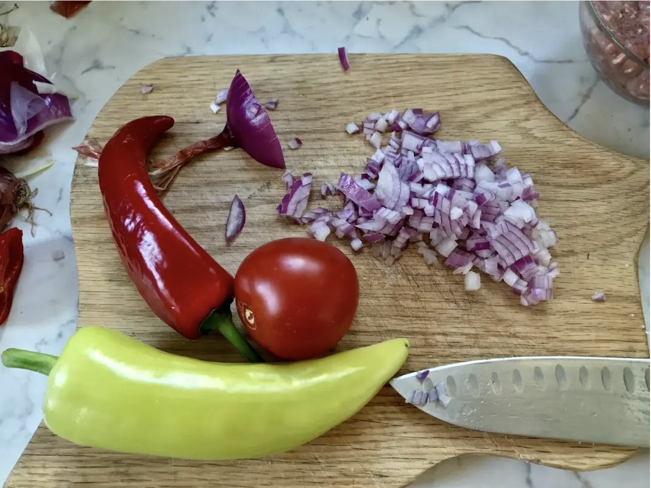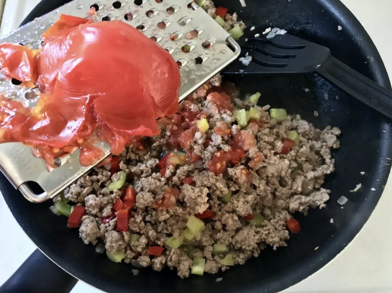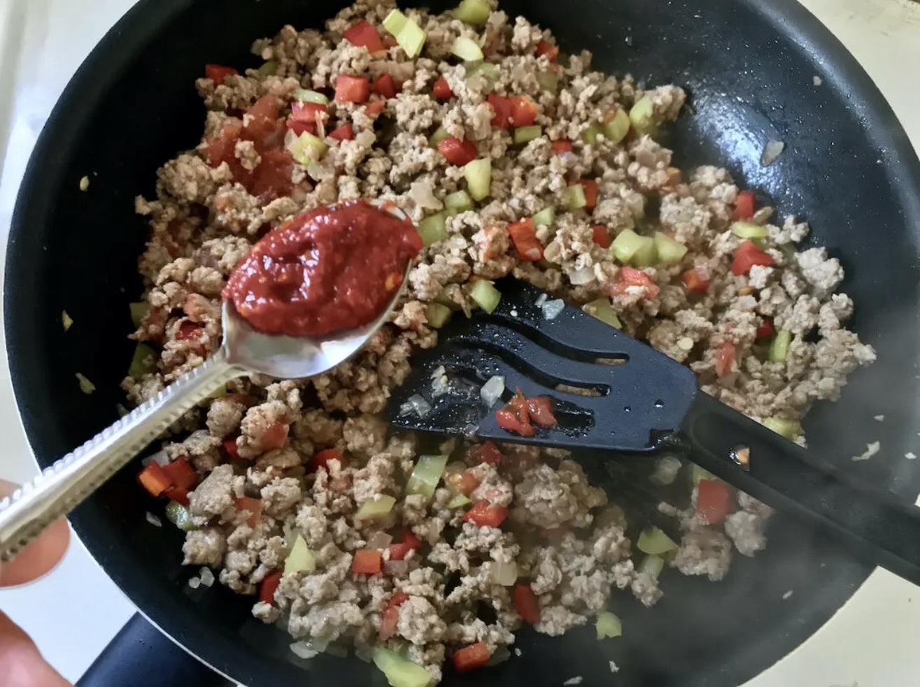 Przygotowanie farszu: Drobno posiekaj cebulę i pokrój paprykę. Na patelni rozgrzej oliwę i zeszklij cebulę. Następnie dodaj mięso i smaż, aż zbrązowieje. Dodaj sól i paprykę. Dodaj starty pomidor oraz ostrą pastę paprykową, a następnie smaż farsz kilka minut i dopraw do smaku.