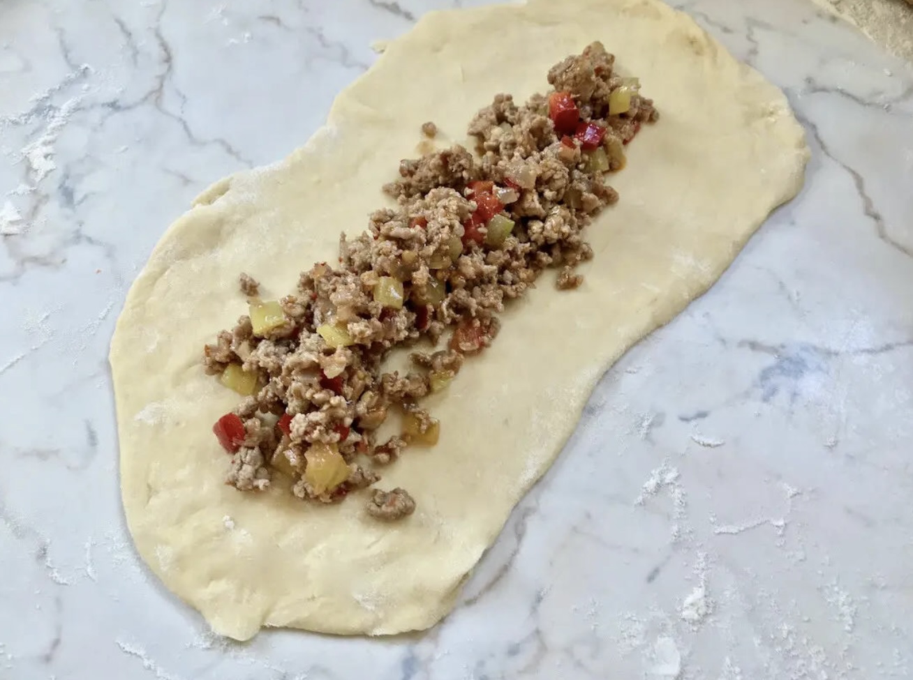 Formowanie i pieczenie: Ciasto podziel na cztery kawałki i każdy rozwałkuj na owalny placek. Nałóż farsz na każdy kawałek ciasta. Złóż boki ciasta, formując z nich kształt łódki.