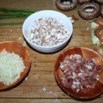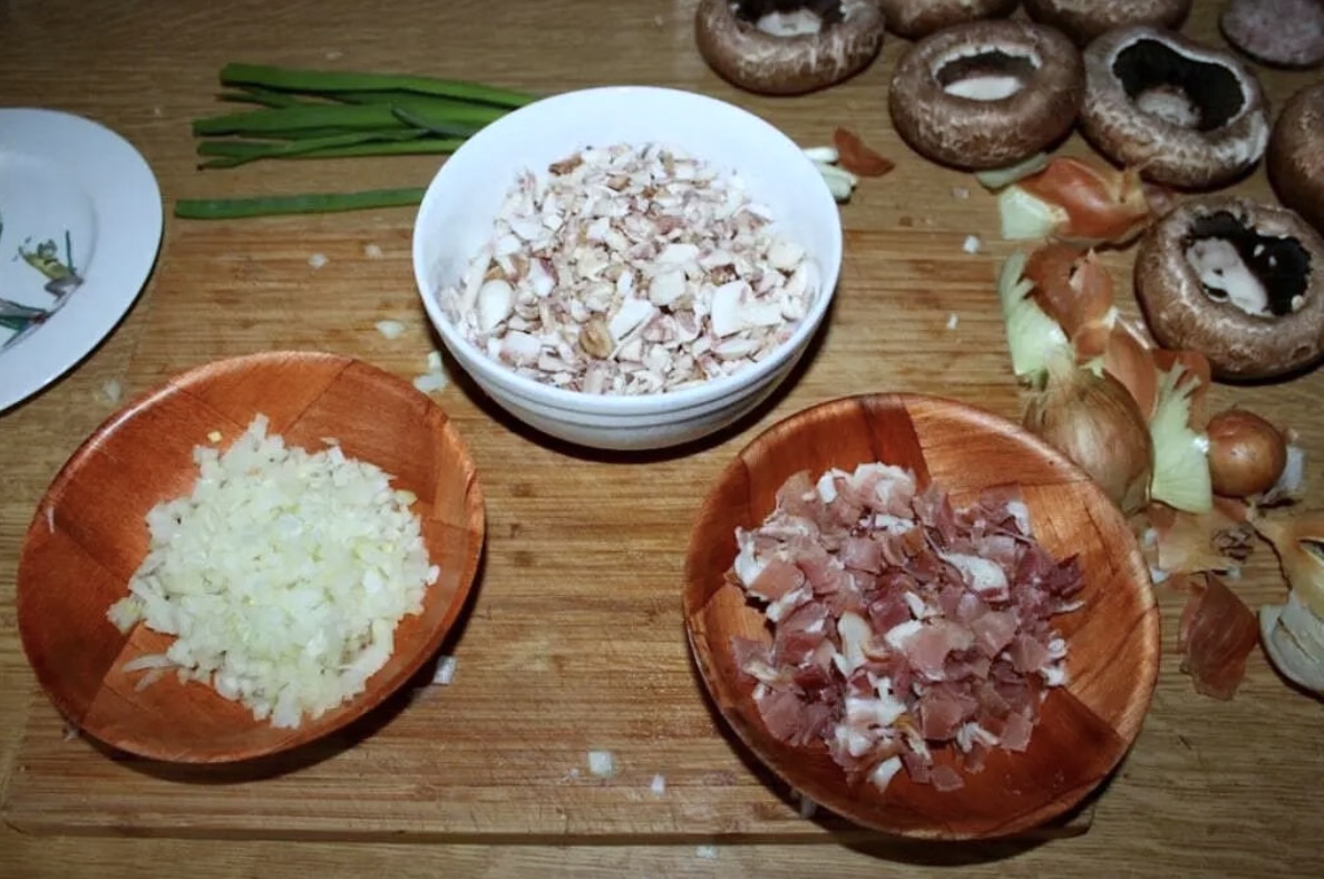 Drobno posiekaj zwykłe pieczarki i dodaj je do posiekanych nóżek.