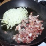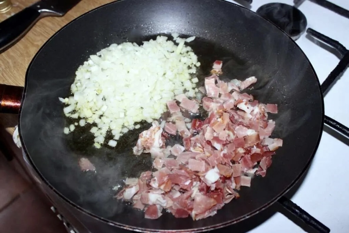 Na patelni rozgrzej oliwę, a następnie wrzuć cebulę i szynkę. Smaż na średnim ogniu.