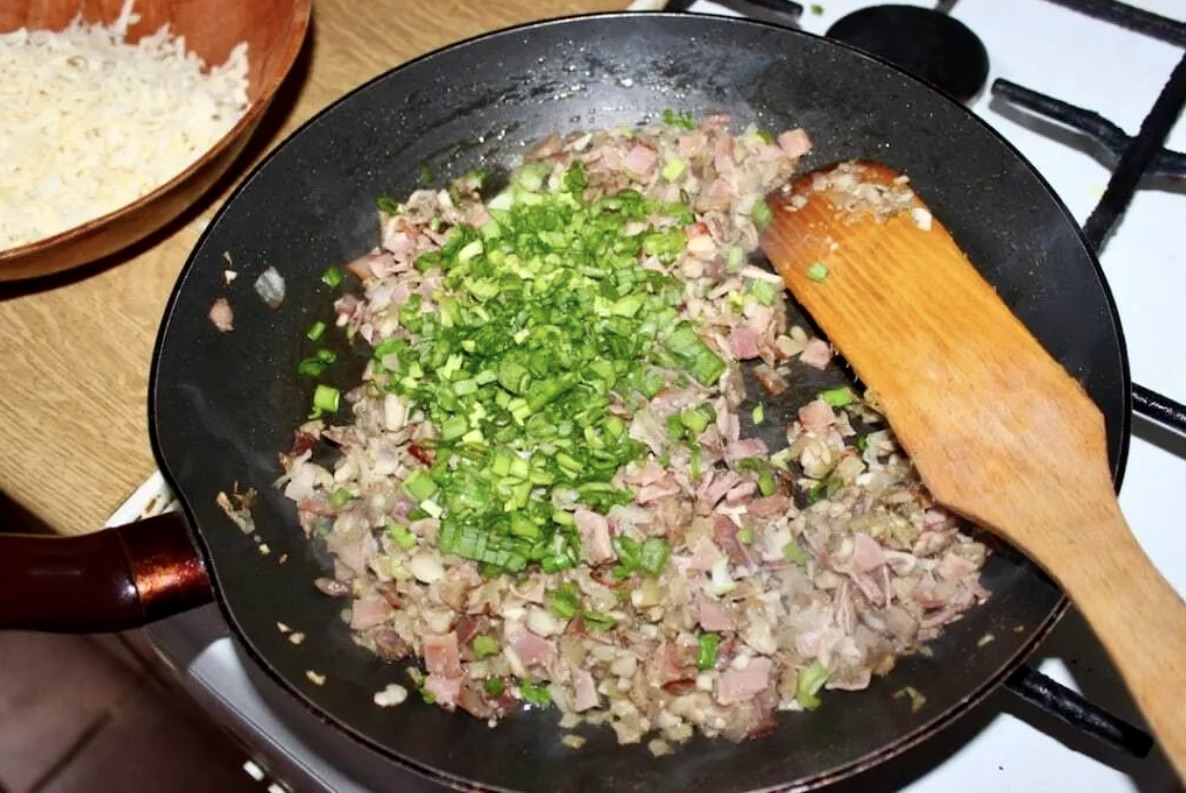 Dodaj starty ser do przesmażonej mieszanki szynki, pieczarek i dymki. Wymieszaj całość.