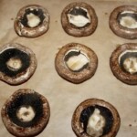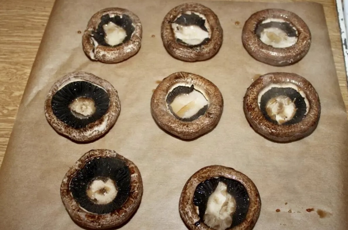 Kapelusze pieczarek Portobello ułóż „grzbietem do góry” na blasze wyłożonej papierem do pieczenia.