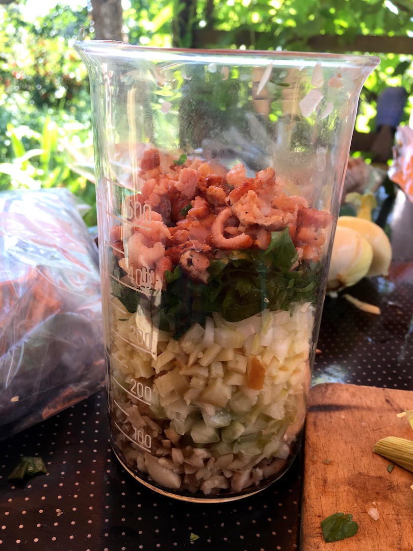 Boczek: Najpierw go grilluj, a następnie pokrój w bardzo drobną kostkę.