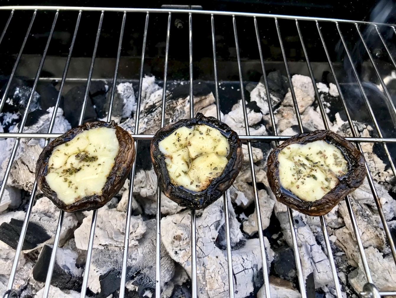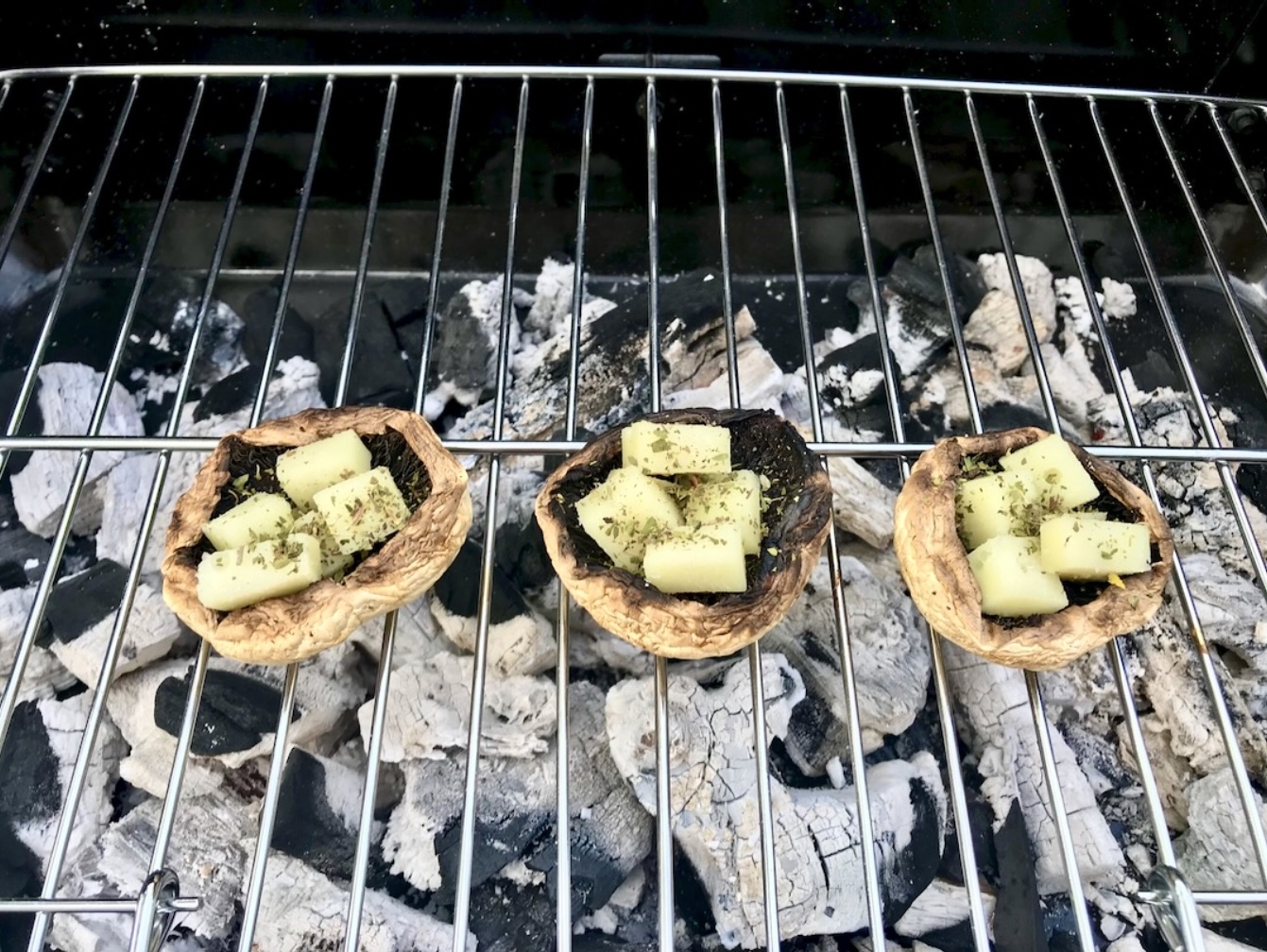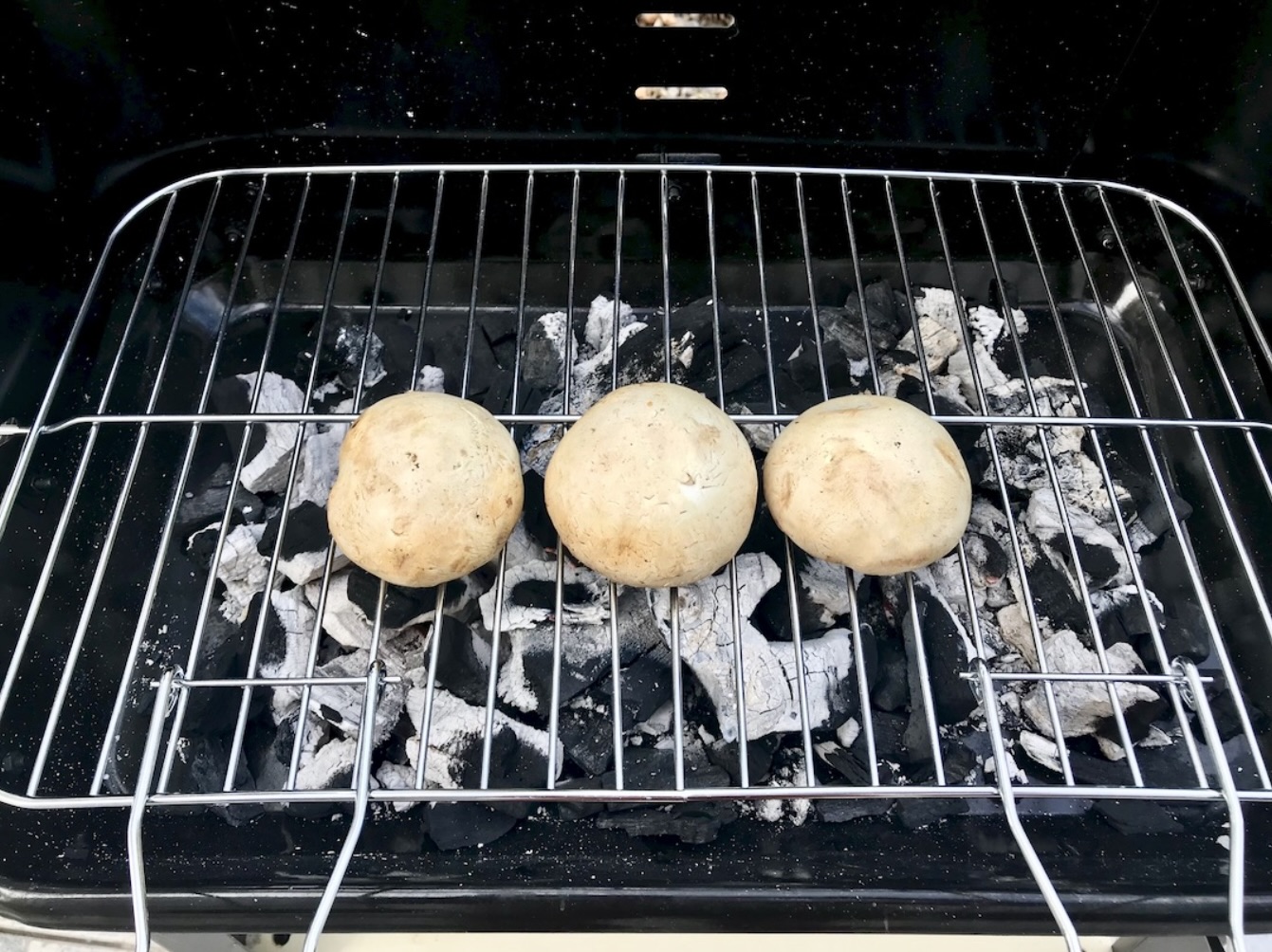 Grillowanie (etap 1): Ułóż pieczarki wnętrzem (otworem) do dołu na mocno rozgrzanym ruszcie grillowym. Grilluj przez kilka minut.