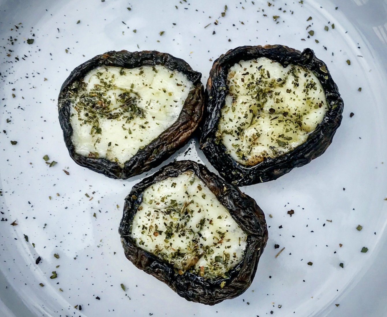 Faszerowanie i grillowanie (etap 2): Gdy pieczarki od spodu będą przyrumienione, odwróć je na ruszcie wnętrzem do góry. Włóż ser do środka kapeluszy i posyp go suszonym oregano. Piecz kolejne kilka minut, aż ser się roztopi.