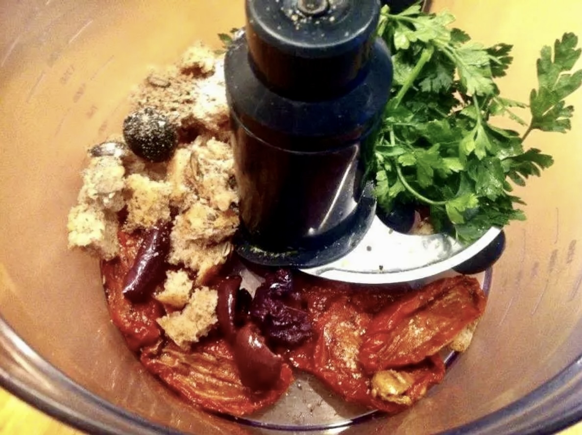 Do malaksera włóż: natkę pietruszki, czarne oliwek, kawałki czerstwego chleba oraz suszone pomidory.