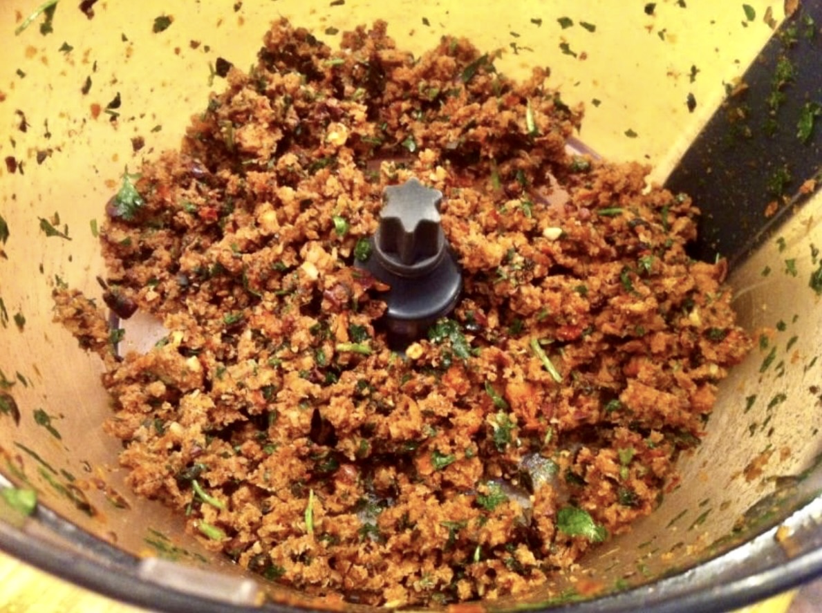 Miksuj pulsacyjnie, aż składniki się połączą i rozdrobią. Kruszonka powinna być lekko sypka, ale wilgotna dzięki oliwie z pomidorów i oliwkom.