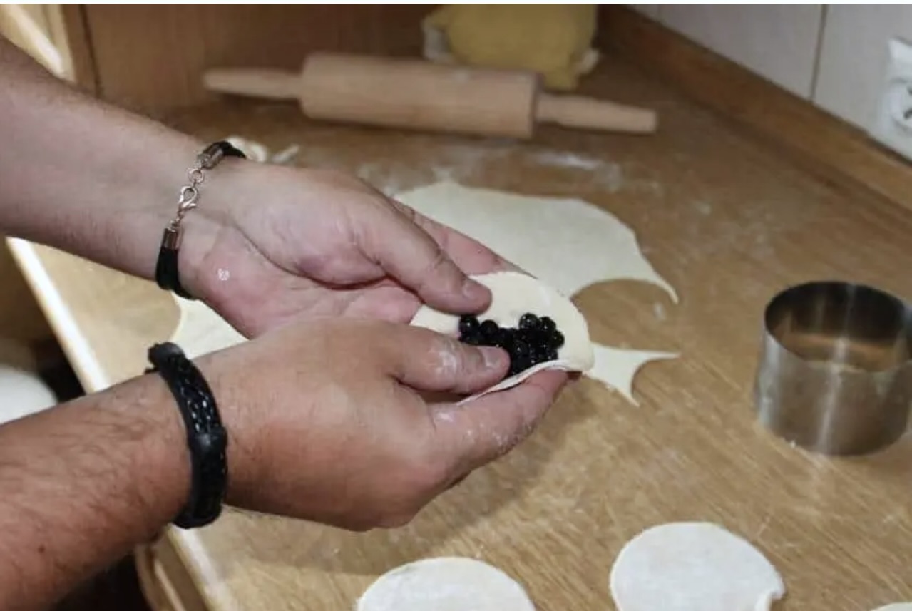 Uwaga: Borówki posypane cukrem szybko puszczają sok, dlatego farsz najlepiej przygotować tuż przed lepieniem. Jeśli borówki puściły sok, można je wcześniej przełożyć na sitko, a sok wykorzystać później.