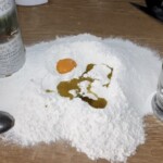 Mąkę przesiej na blat, dodaj 1 żółtko, szczyptę soli, 2 łyżki oliwy i przesiekaj nożem.