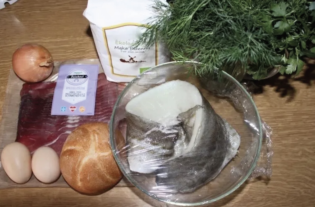 Ryby pokrój na kawałki i zmiel razem z kajzerką oraz szynką dojrzewającą (lub speckiem) w maszynce do mielenia. Bułka ma wchłonąć nadmiar wody.