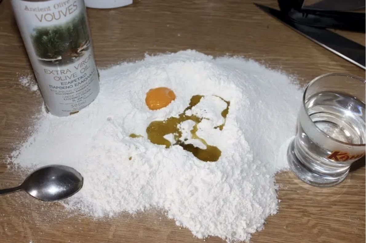 Mąkę przesiej na blat, dodaj 1 żółtko, szczyptę soli, 2 łyżki oliwy i przesiekaj nożem.