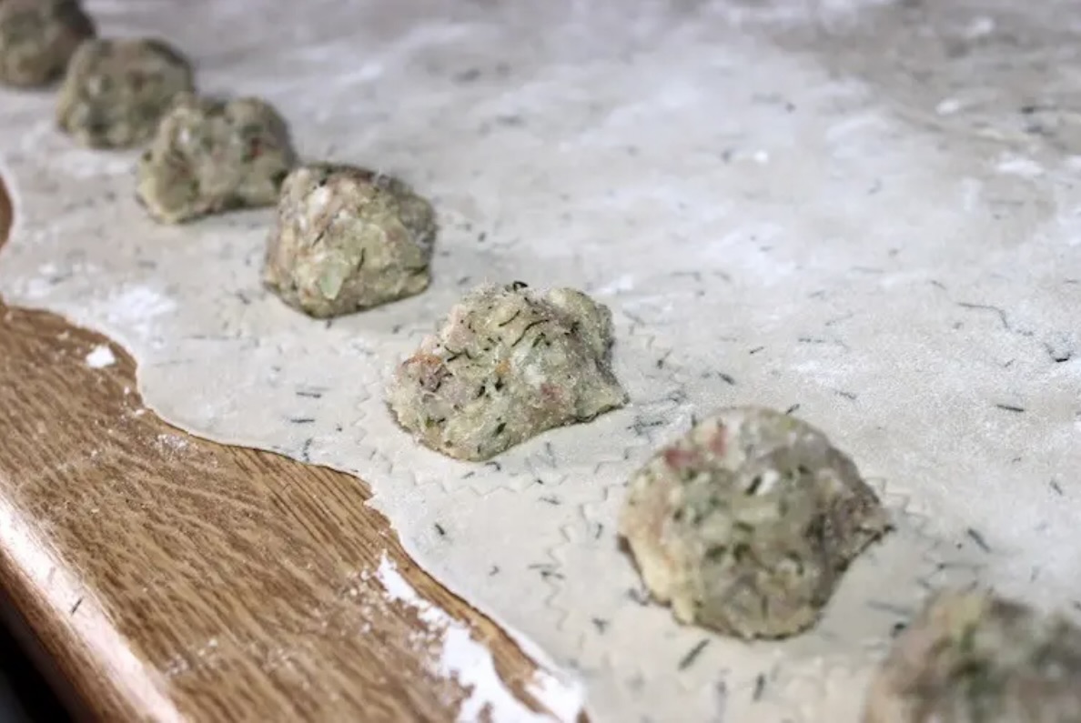 Nakładaj około 20 gramów farszu na wycięte lub zaznaczone na cieście kółka/kawałki.
