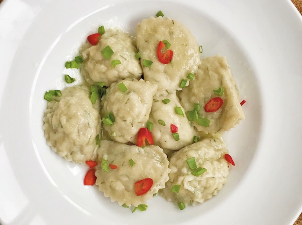 Podawaj pierogi okraszone stopionym masłem, z dymką i papryczką chilli.