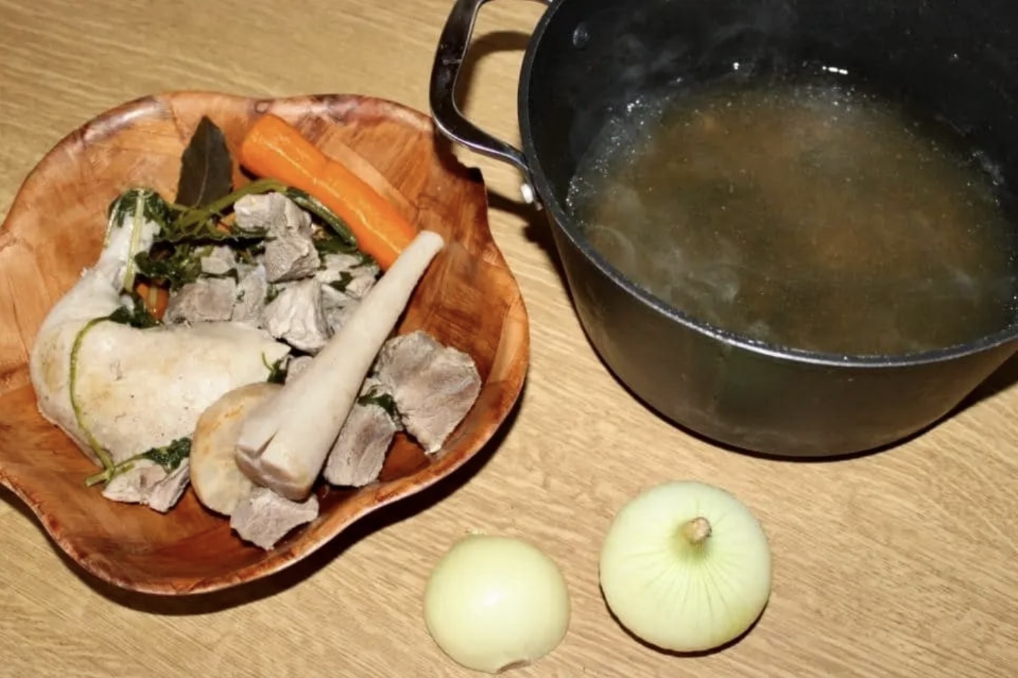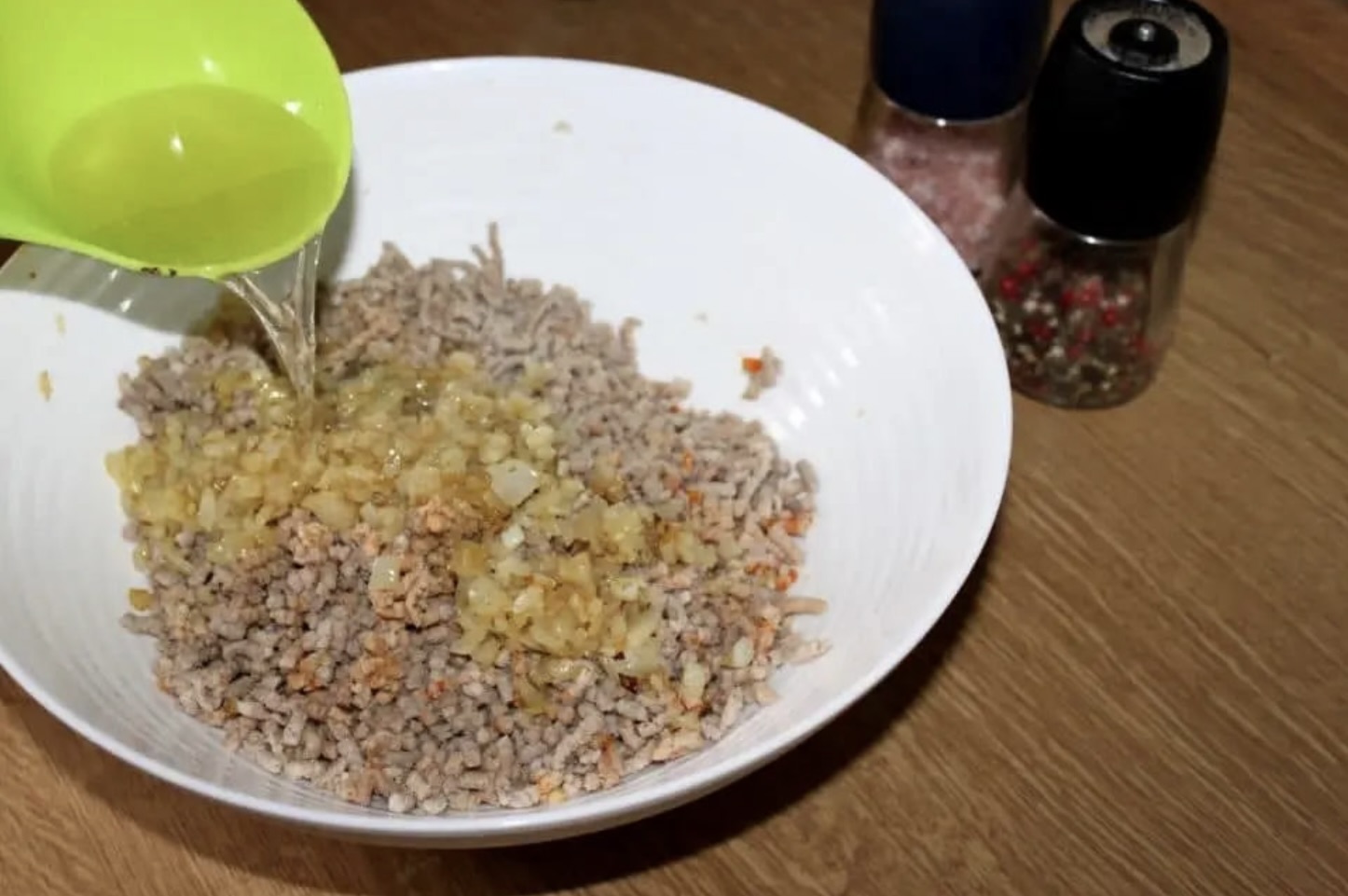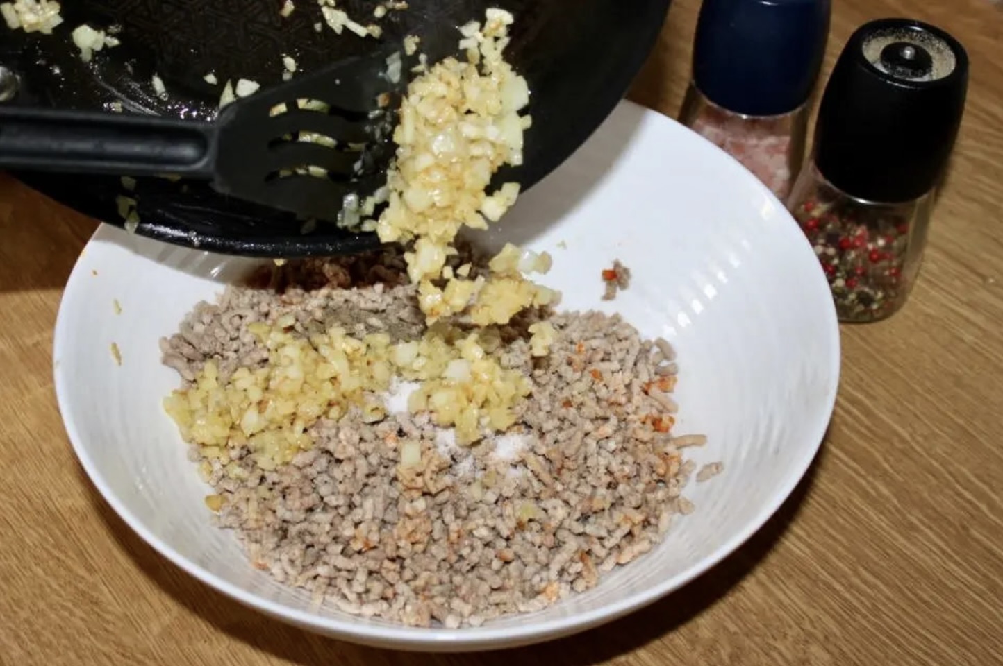 Przygotowanie farszu: Ostudzone mięso i część ugotowanych warzyw pokrój w kostkę, a następnie zmiel maszynką. Dodaj do niego przesmażoną na maśle, drobno pokrojoną cebulę oraz 2 chochle rosołu z gotowania mięsa, aby farsz był wilgotny i klejący. Farsz należy intensywnie doprawić solą i dużą ilością pieprzu.