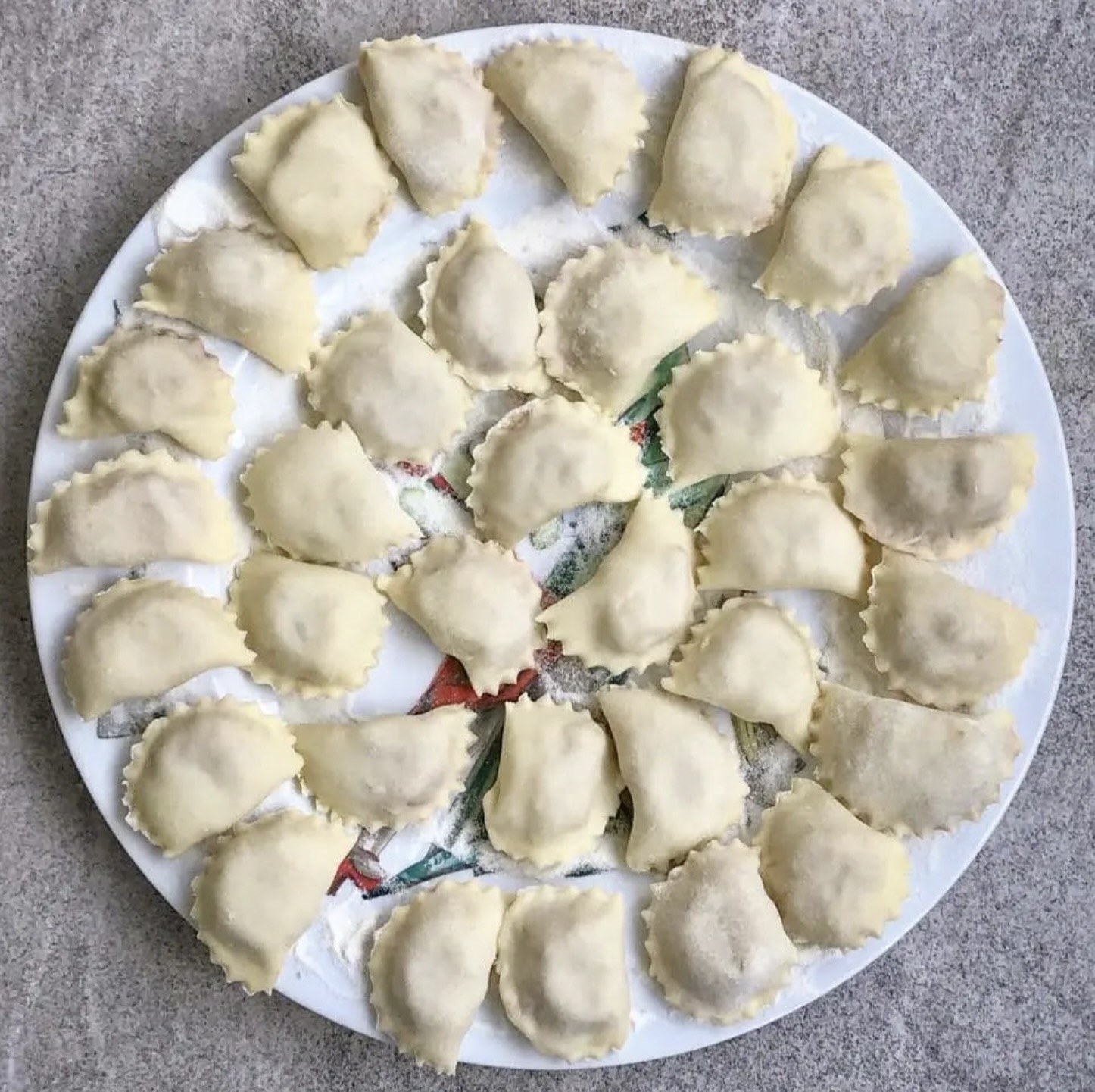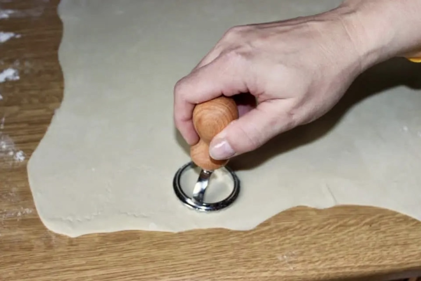 Lepienie: Ciasto wałkuj cienko, nakładaj farsz i zlepiaj pierogi, usuwając powietrze, a następnie wykrawaj.