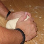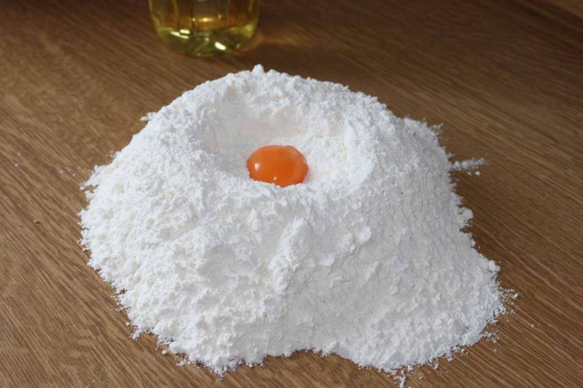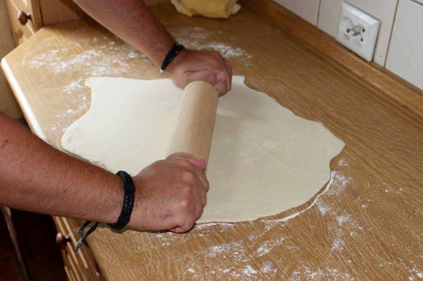 Ciasto: Na blat wysyp 400 gramów mąki pszennej, dodaj jedno żółtko, pół łyżeczki soli oraz łyżkę oliwy. Nożem rozprowadź składniki, a następnie dolewaj ciepłej wody, aż uzyskasz właściwą, gładką i elastyczną konsystencję ciasta.