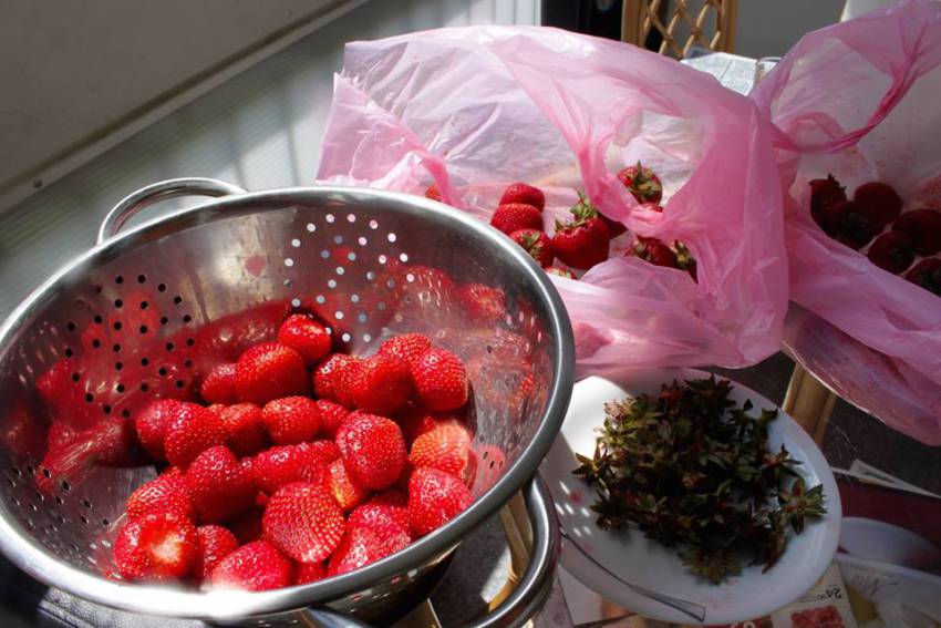 Truskawki: Wybierz około 40 sztuk ładnych, słodkich i jędrnych truskawek o zbliżonej wielkości. Jeśli są większe, można je przekroić na pół. Na razie ich nie płucz, pozostaw na durszlaku.