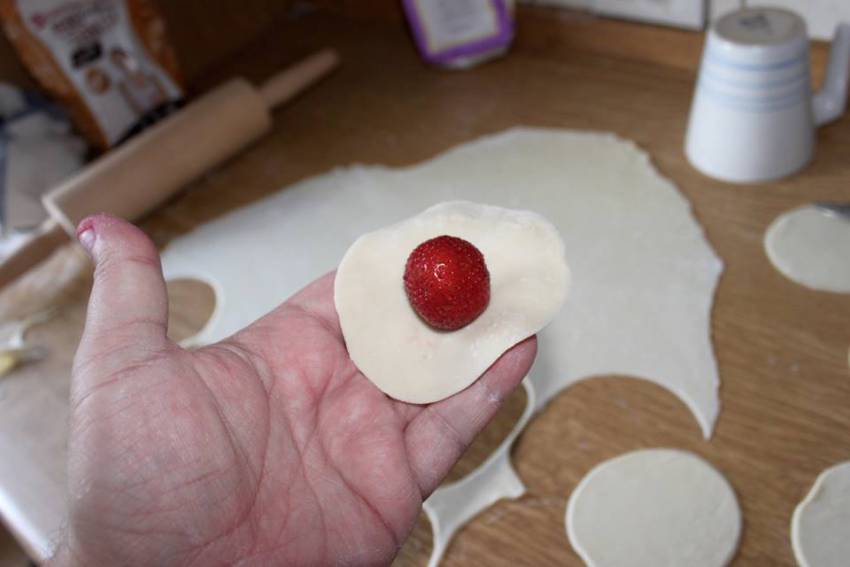Nadziewanie: Szybko opłucz truskawki i odsącz z wody. Na każde kółko ciasta nakładaj truskawkę, boki posmaruj ciepłą wodą i sklejaj pierogi.