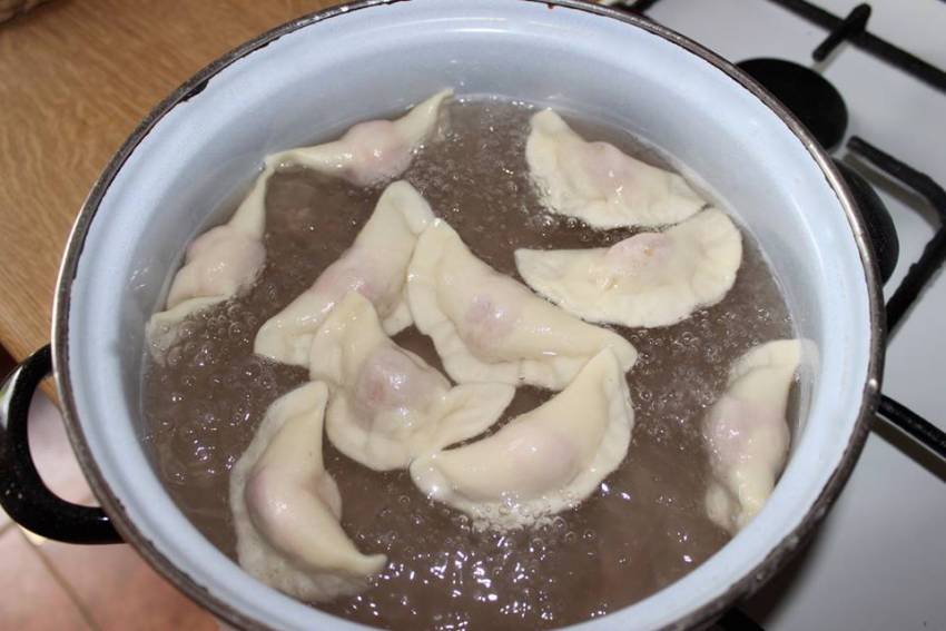Gotowanie: Gotowe pierogi układaj na talerzu lekko podsypanym mąką. Gotuj w osolonej wodzie na dość wolnym ogniu przez około 4 minuty od ich wypłynięcia.