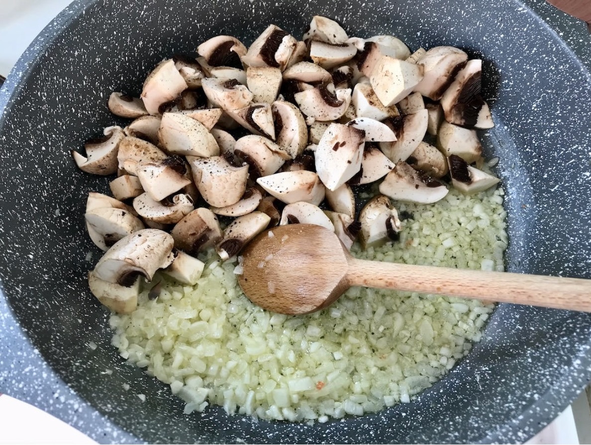 Na patelni rozgrzej oliwę z odrobiną masła. Najpierw zeszklij cebulę, a następnie dodaj pieczarki.